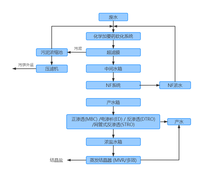 废水零排放处理设备系统主要分为如下三种工艺流程: