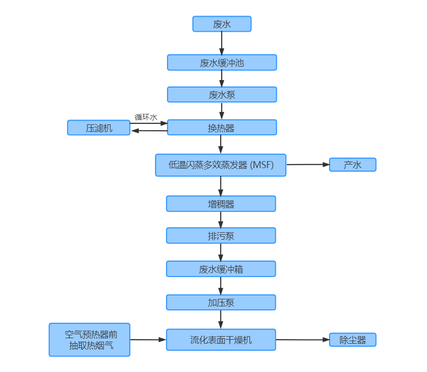 废水不需预处理系统,直接利用低温烟气的热量对废水进行预热,而后经过多效闪蒸浓缩,浓缩物浓度可在线自动可调,浓缩后的浓液进入流化表面干燥机蒸发干燥,产生的粉尘及水蒸气随烟气引入电除尘前烟道,利用电除尘捕捉氯离子和其他固态颗粒及金属元素,蒸发的水蒸汽进入脱硫塔。闪蒸浓缩过程中产生水蒸汽,经过凝结后可回收至脱硫工艺水或其它用途补水。