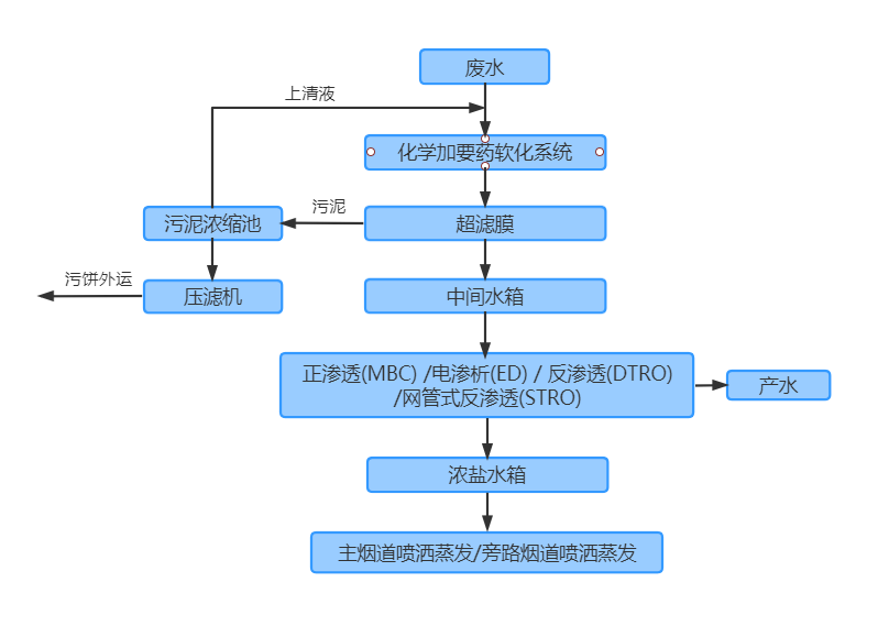 膜浓缩系统的产水直接回收利用,浓缩液进行烟道蒸发,利用高温烟气将雾化后的废水液滴蒸干,废水中的污染物形成细小固体结晶,随烟气中的灰尘进入电除尘器被电极扑捉,进入除尘器灰斗外排,从而除去污染物,系统无结晶盐的产生,部分水份在脱硫塔中重新凝结被回收利用,较大程度节水节能,达到废水的零排放,目前烟道蒸发工艺主要分为主烟道蒸发和旁烟道蒸发两种技术。