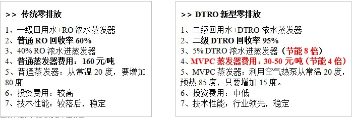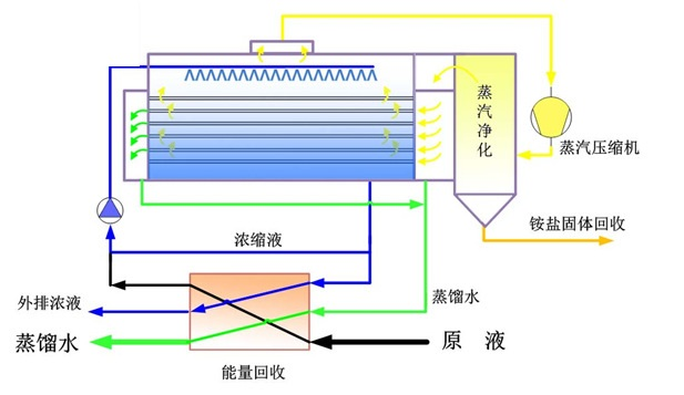 经DTRO回用水系统后的废水进入高效低能耗洁净蒸发MVPC装置, 在蒸发装置内利用热泵原理,把原液的水蒸发,蒸汽经冷凝后变成蒸馏水排出。