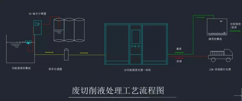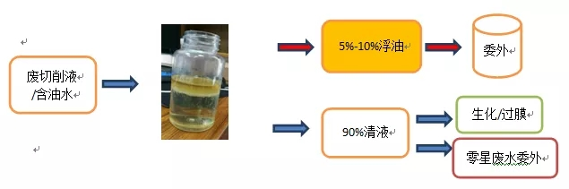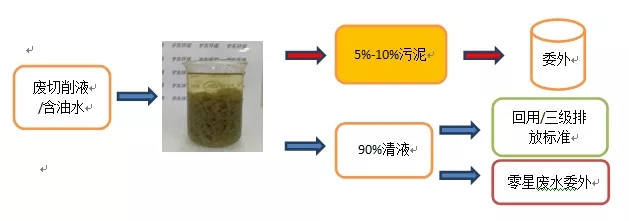 该方法的特点是:设备投入资金小,按照每天处理1吨废切削液来说,投资成本从几万到十来万左右。这种设备结构比较简单,故障率低,维修及维护成本极低,产生的废泥量或废油量较少,是一种能较大程度减量的方法。缺点是有药剂成本,处理每吨废切削液的破乳剂成本基本在200-500元左右。产生的清液,在进一步处理后即达到国标排放标准或国标工艺废水回用标准。