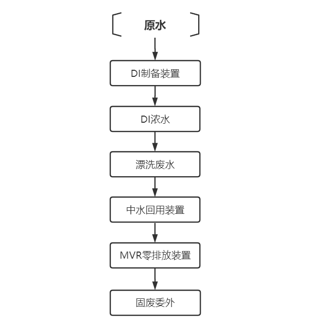 原水 → DI制备装置 → DI浓水 → 漂洗废水 → 中水回用装置 → MVR零排放装置 → 固废委外